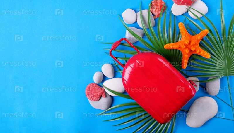 Плоская квартира лежала с красным чемоданом, камнями, морскими звездами, морскими раковинами и пальмовыми листьями на синем фоне. Концепция летних каникул. Копировать пространство