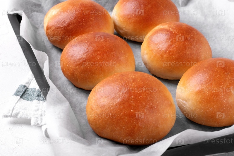 Золотые дрожжевые булочки на подносе для духовки. Домашняя выпечка
