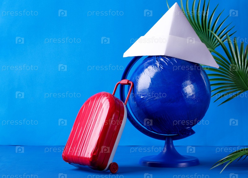 Макет голубого глобуса в бумажной шляпе с красным чемоданом и пальмовыми листьями на синем фоне. Концепция путешествий и отдыха