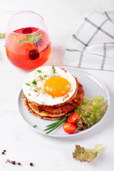 Яичница на стопке оладий из цуккини и ягодный лимонад в стакане на белом столе. Подается обед на тарелке