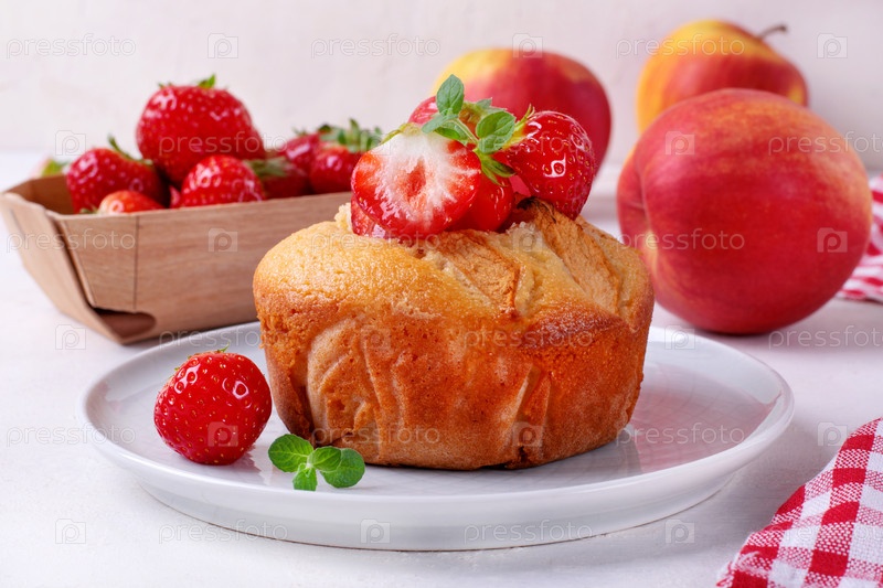Пирог из манной крупы или манник с яблоком, клубникой и мятой. Фрукты и ягоды на заднем плане на белом столе. Десерт советской кухни
