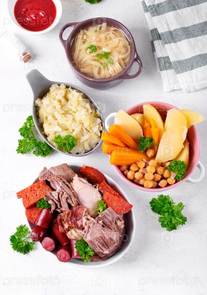Cocido madrileno, традиционная испанская рагу с разнообразным мясом, овощами, нотом и лапшой, подаваемая отдельно на белом столе