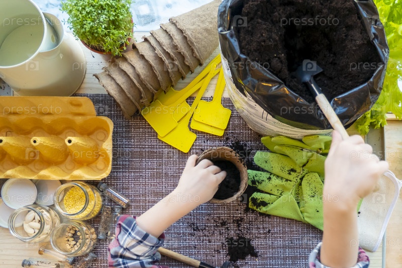 Мальчик насыпает почву в торфяной горшок для рассады. плоская кладка