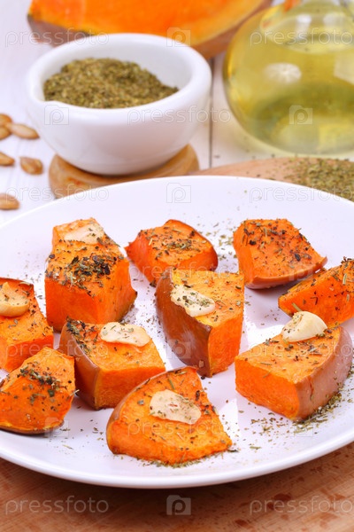 Тушеная тыква с прованскими травами на белом деревянном фоне