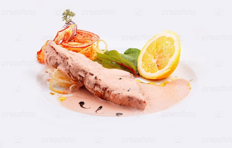 Семга с ореховым соусом на белом фоне