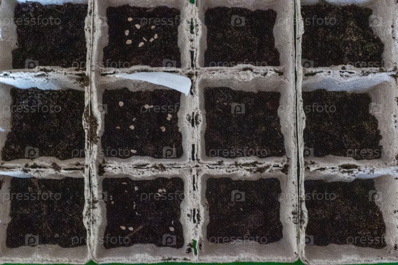 Семена в стартовом бумажном ящике Вид сверху. Ящик для рассады