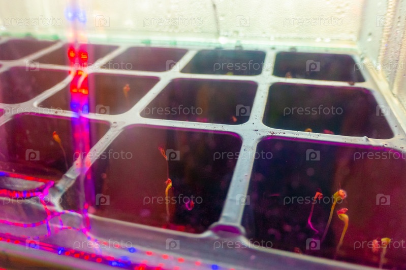 Маленькие ростки в ящике при свете фитолампы. крупный план
