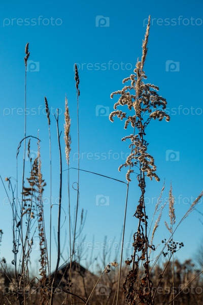 Сухой тростник на фоне ясного голубого неба в солнечный день на открытом воздухе. Абстрактный естественный фон в нейтральных тонах. Минимальные модные метелки пампасной травы. Выборочный фокус