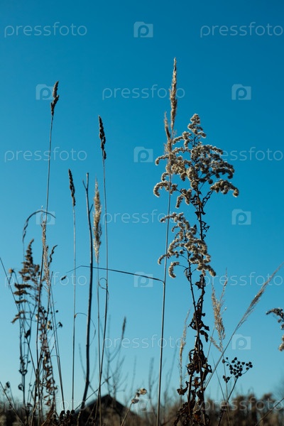Сухой тростник на фоне ясного голубого неба в солнечный день на открытом воздухе. Абстрактный естественный фон в нейтральных тонах. Минимальные модные метелки пампасной травы. Выборочный фокус