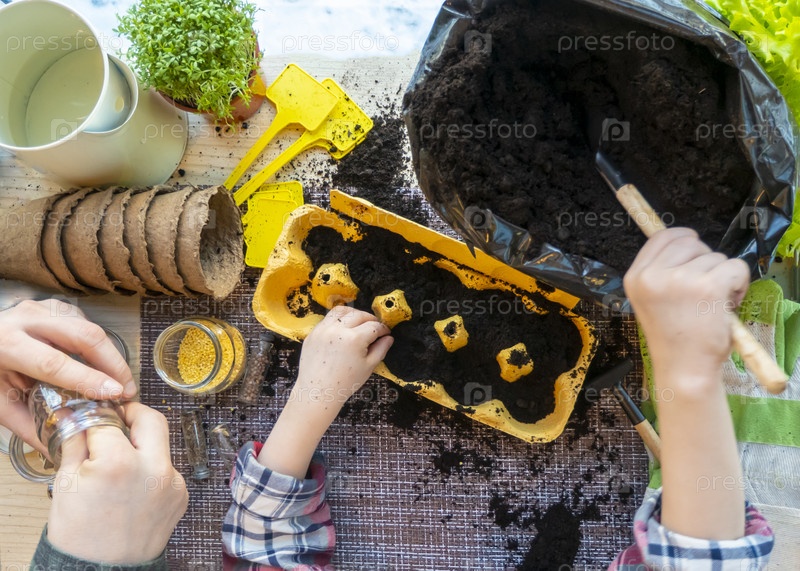 Ребенок насыпает землю в кассеты из яиц для рассады. концепция экологии, ноль отходов. плоская планировка