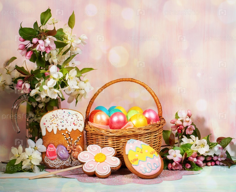 Пасхальная композиция из корзины расписных пасхальных яиц, расписных пряников, веток яблони на фоне с боке