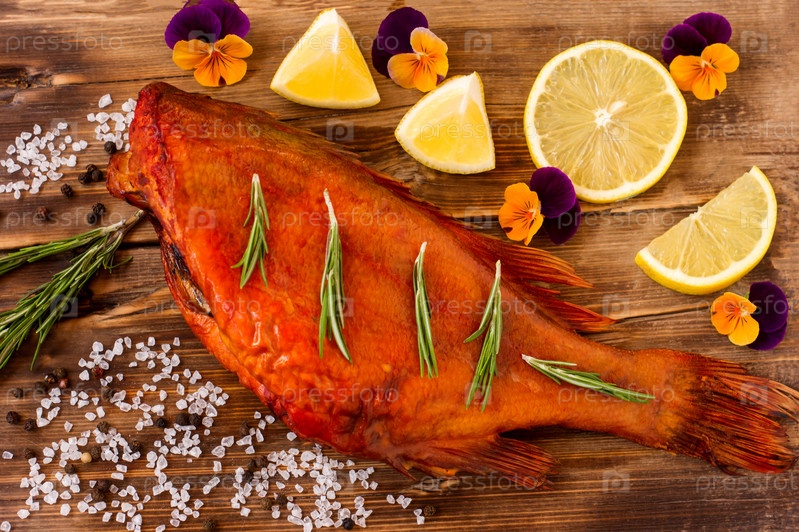 Вкусный копченый морской окунь на деревянной разделочной доске для здоровой пищи, диеты или кулинарной концепции, избирательный фокус
