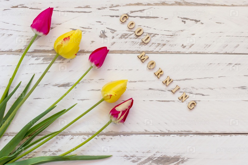 Розовые и желтые тюльпаны на деревянной спинке. Весенняя открытка с копией пространства. Доброе утро цитата