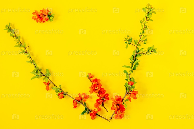 Абстрактный весенний фон. Ветка цветущей японской айвы на желтом фоне. Хеномелес японский. Плоская планировка, вид сверху. Композиция из весенних цветов