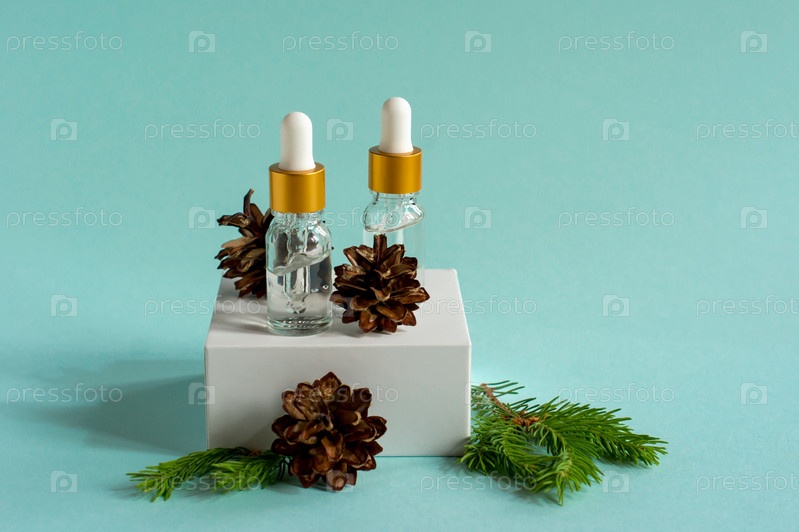 Эфирное масло кедра и ели в маленьких стеклянных бутылках на модном подиуме на синем фоне