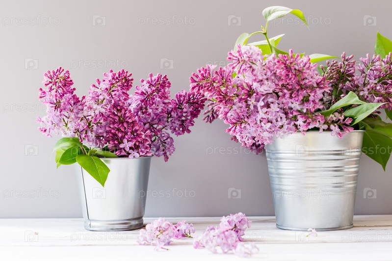 Два декоративных железных ведра с ветвями фиолетовой сирени на белом деревянном столе. украшение загородного дома
