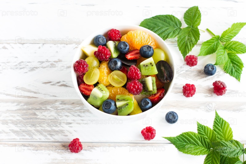 Фруктовый салат с бананом, киви, виноградом, малиной, черникой в миске на белом деревянном столе