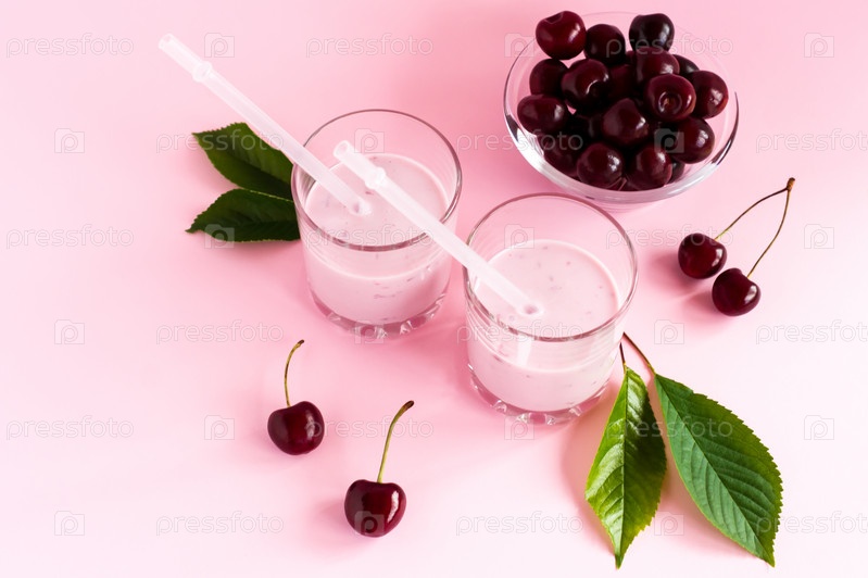 Два стакана со смузи из спелой вишни на розовом фоне. здоровая органическая пища
