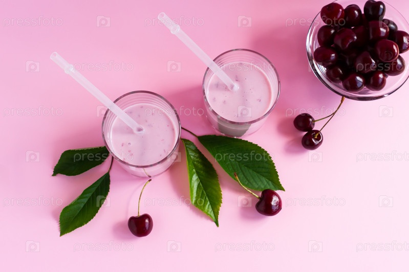 Вишневый коктейль в стеклянных стаканах на розовом фоне. стеклянная чаша со спелыми вишнями. здоровая пища