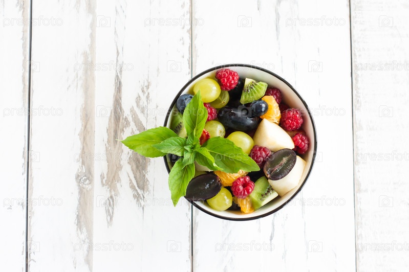 Летний фруктовый салат с листьями мяты в миске на деревянном белом столе. вкусный десерт, концепция похудения