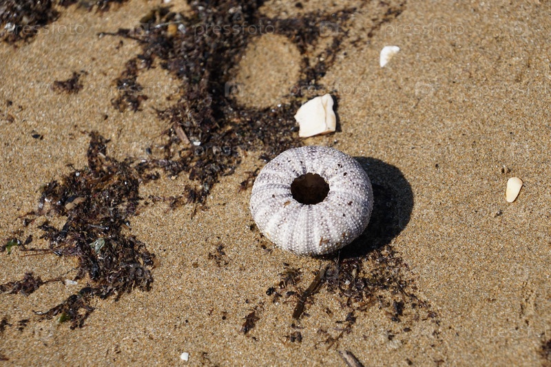 Скелет морского ежа на фоне песка и водорослей