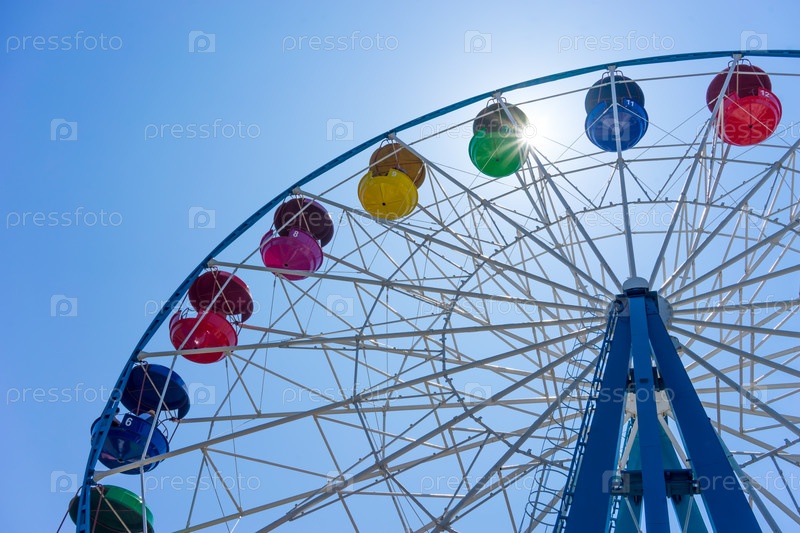 Колесо обозрения с цветными кабинками на фоне голубого неба