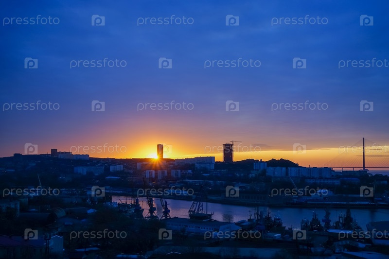 Городской пейзаж с видом на восход солнца. Владивосток