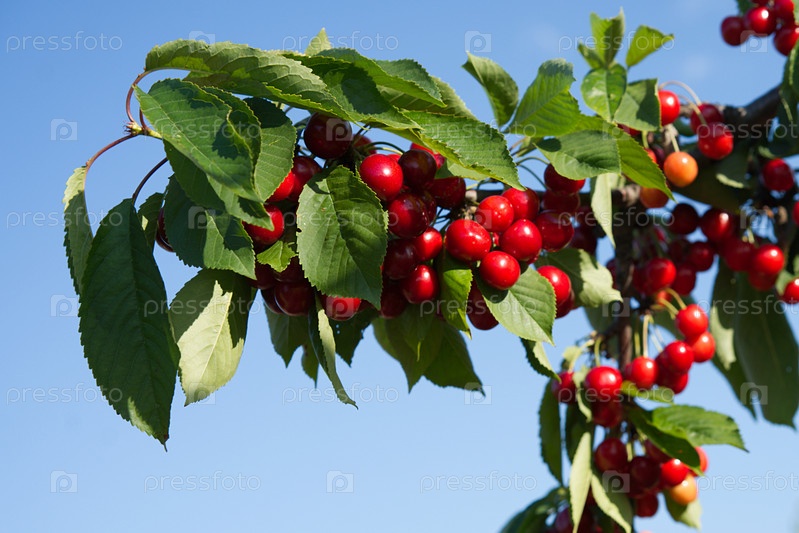 Ветки с плодами красной вишни на фоне голубого неба