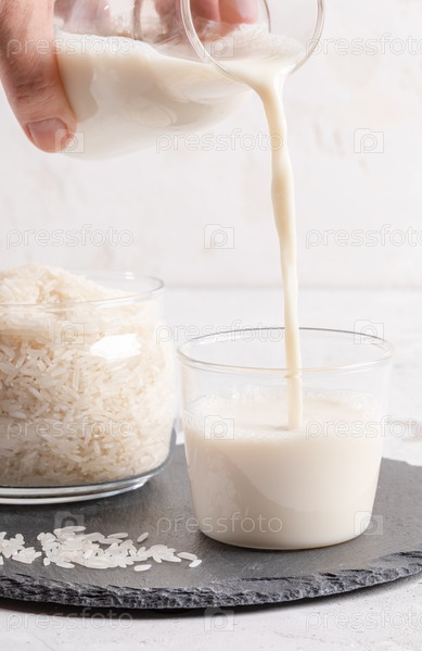 Женская рука наливает здоровое рисовое молоко из прозрачной стеклянной бутылки в стакан для питья и стеклянную банку с семенами риса на светлом фоне. Концепция безлактозного молока. Изображение с копией пространства