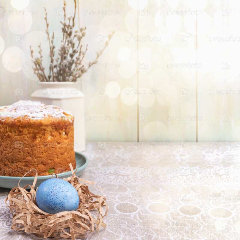 Пасхальный фон с боке, кулич, голубое яйцо, ветки ивы на столе у деревянной стены с копией пространства