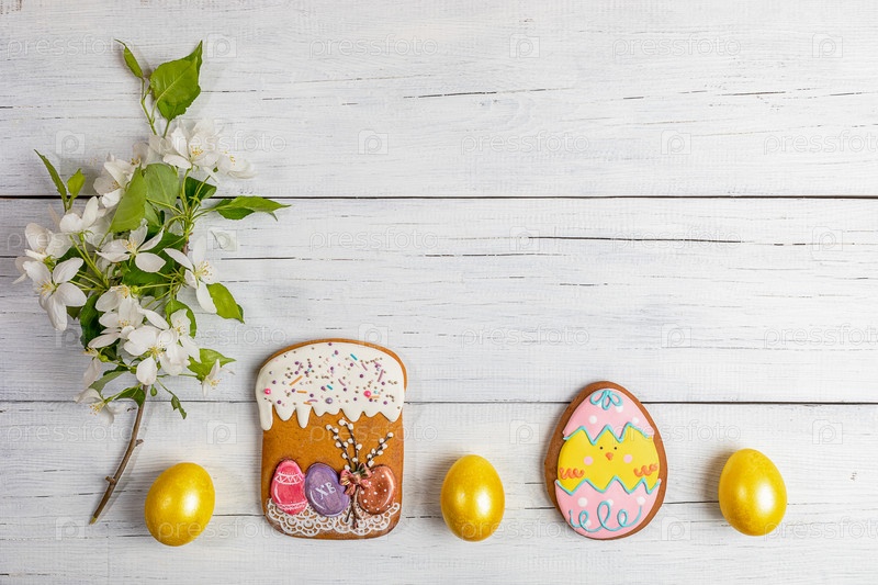 Пасхальный фон из выложенной веточки яблони, желтых яиц, пряников на белом деревянном столе