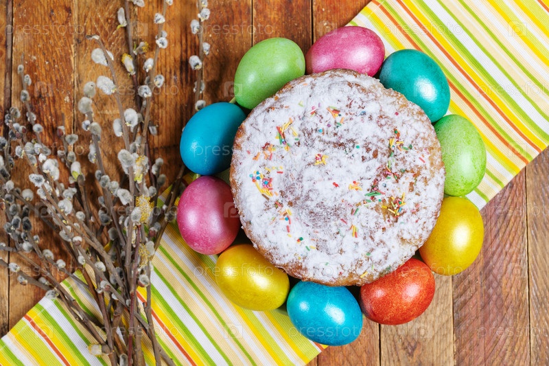 Пасхальные украшения, фон. Домашний пасхальный кулич с крашеными яйцами вокруг него и ветвями ивы на полосатом кухонном полотенце на деревянном столе. Вид сверху