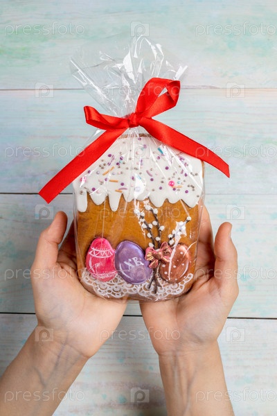 Пасхальное украшение. Женские руки держат имбирный пасхальный кулич, упакованный в целлофан в подарок на деревянном фоне