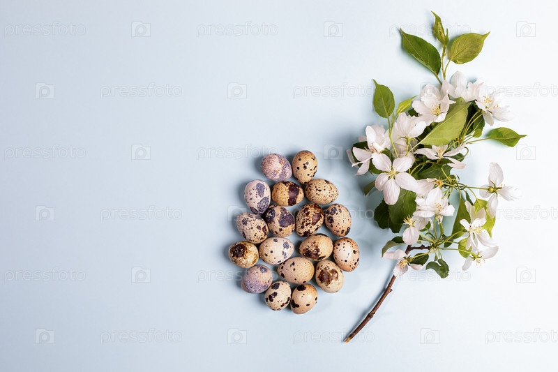 Куча перепелиных яиц, выложенных в виде большого пасхального яйца с белой веткой яблони на голубом