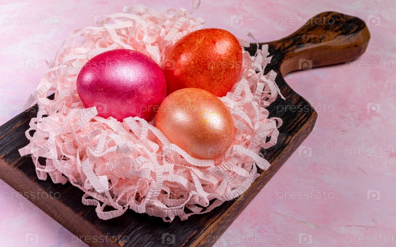 Три цветных яйца в гнезде из розовых бумажных клочков на темной деревянной кухонной доске на розовом текстурированном фоне. Крупный план