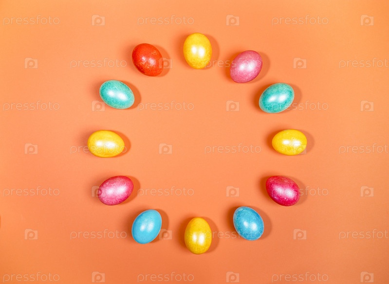 Разноцветные глянцевые пасхальные яйца, выложенные по кругу на модном оранжевом фоне. Креативный праздничный пасхальный фон