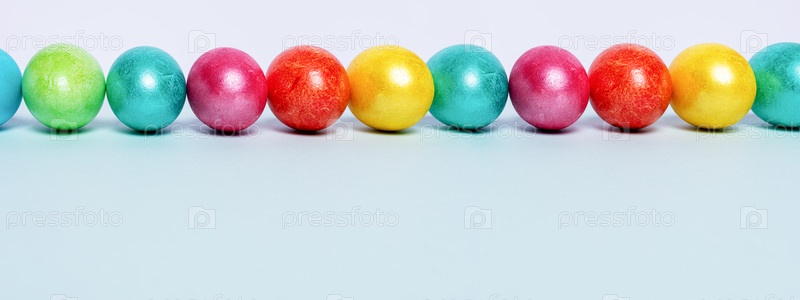 Ряд ярко окрашенных глянцевых пасхальных яиц на голубом фоне. Пасхальное знамя. Скопируйте пространство, низкий угол