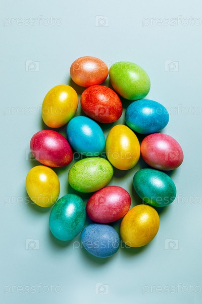 Пасхальная композиция. Цветные глянцевые яйца, выложенные в виде большого пасхального яйца на голубом пастельном фоне