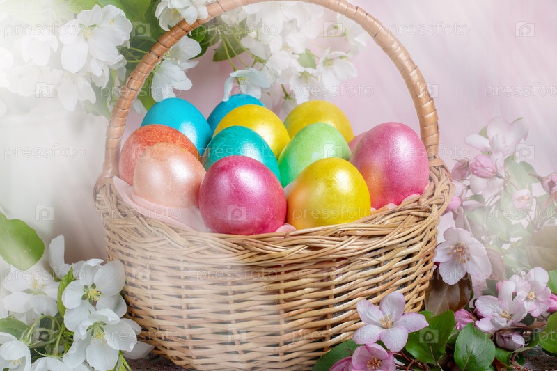 Крупный план пасхальной праздничной композиции из корзины расписных пасхальных яиц и веток яблони на заднем плане со световыми лучами