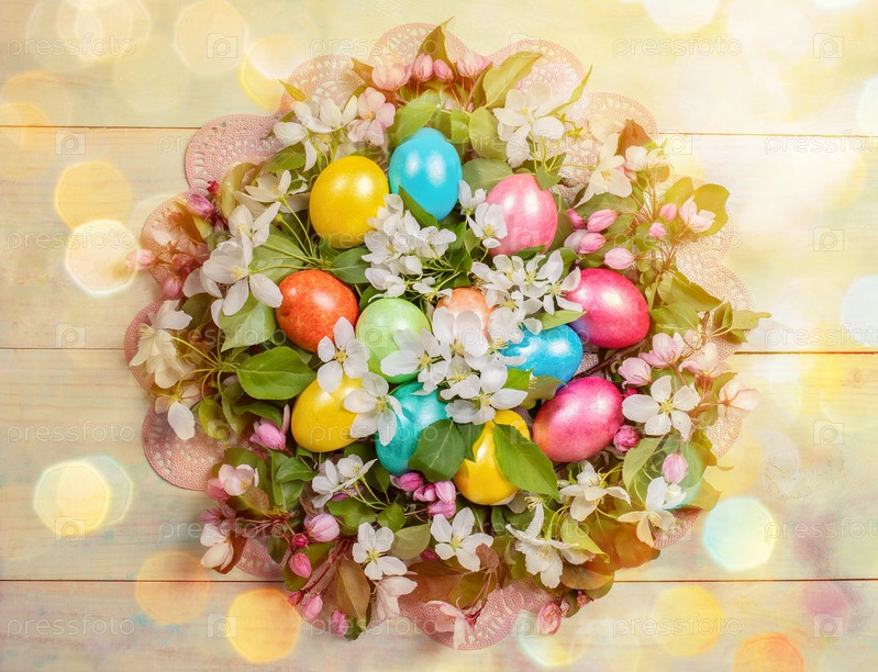 Пасхальная праздничная круглая композиция из разноцветных пасхальных яиц и веточек яблони на деревянном фоне с боке