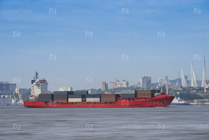 Морской пейзаж с красным контейнеровозом на фоне городского пейзажа