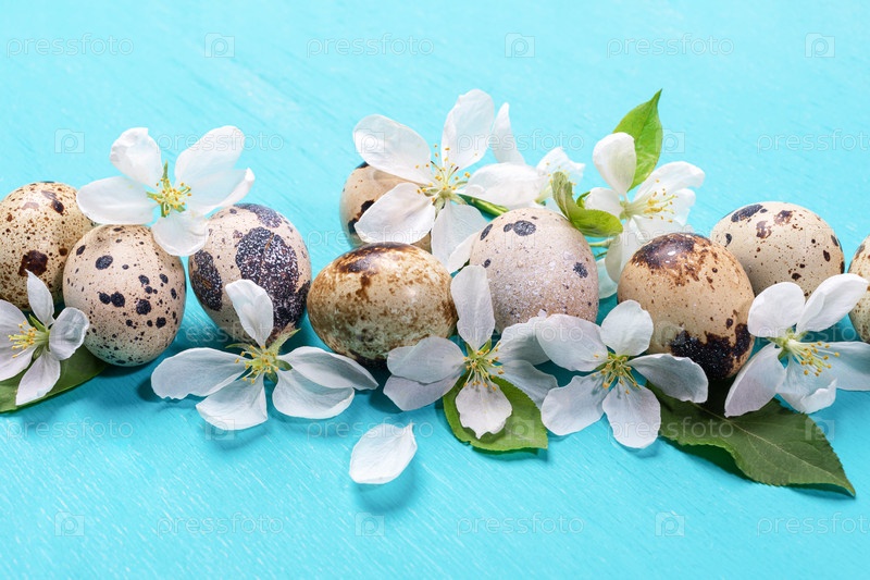 Крупным планом праздничный пасхальный фон с пятнистыми перепелиными яйцами и белыми цветами яблони на бирюзовом деревянном фоне
