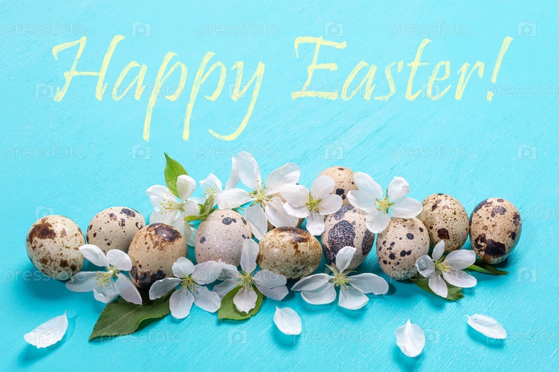 Праздничная пасхальная открытка с яйцами лебедей, белыми цветами яблони и словами 'Счастливая Пасха' на бирюзовом фоне