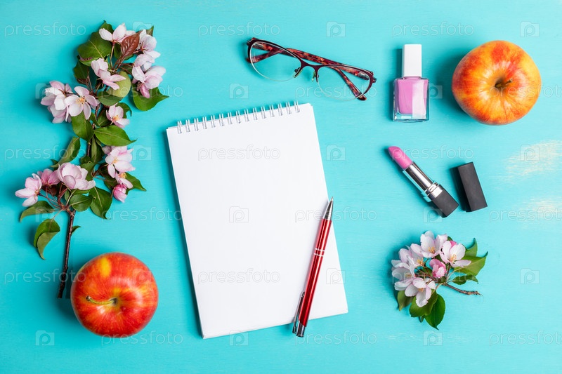 Бирюзовый макет с белым блокнотом с ручкой, женскими очками, помадой и лаком для ногтей, яблоками и веточками яблони