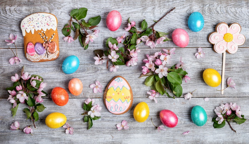 Пасхальная праздничная раскладка из розовых веточек яблони, перепелиных и крашеных куриных яиц, разноцветных пряников на деревянном столе