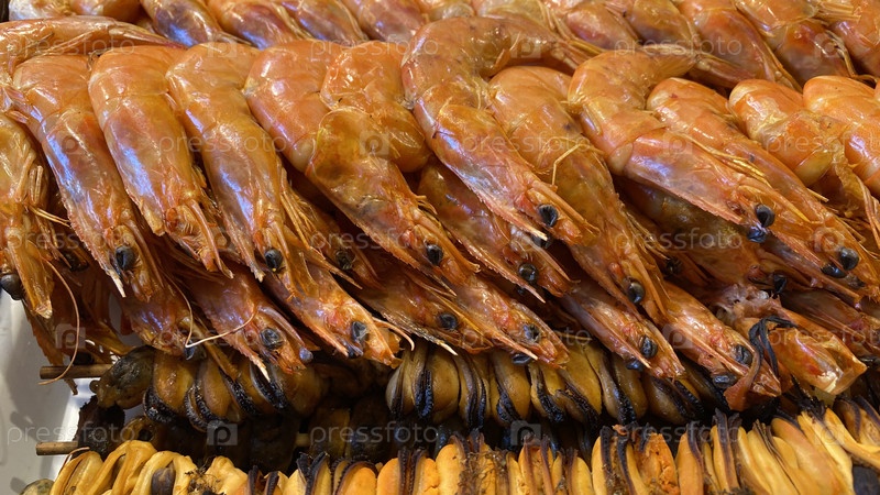 Копченые креветки крупным планом. Морепродукты, деликатесы