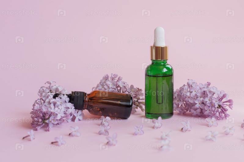 Средства по уходу за кожей - эфирное масло и сыворотка - на фоне свежей сирени, крупный план, сирень в качестве фона. Концепция ухода за кожей и красоты