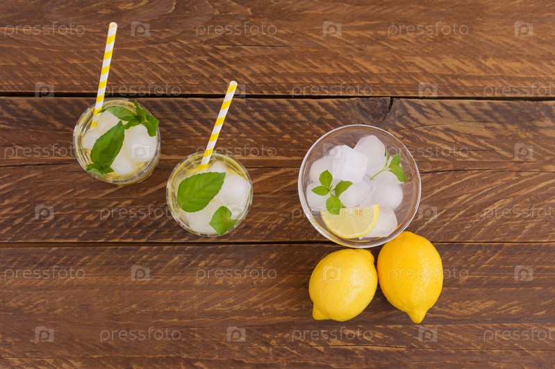 Вид сверху на летние охлаждающие напитки на деревянном столе.Coolig свежий лимонад с лаймом, лимоном, листьями мяты и льдом