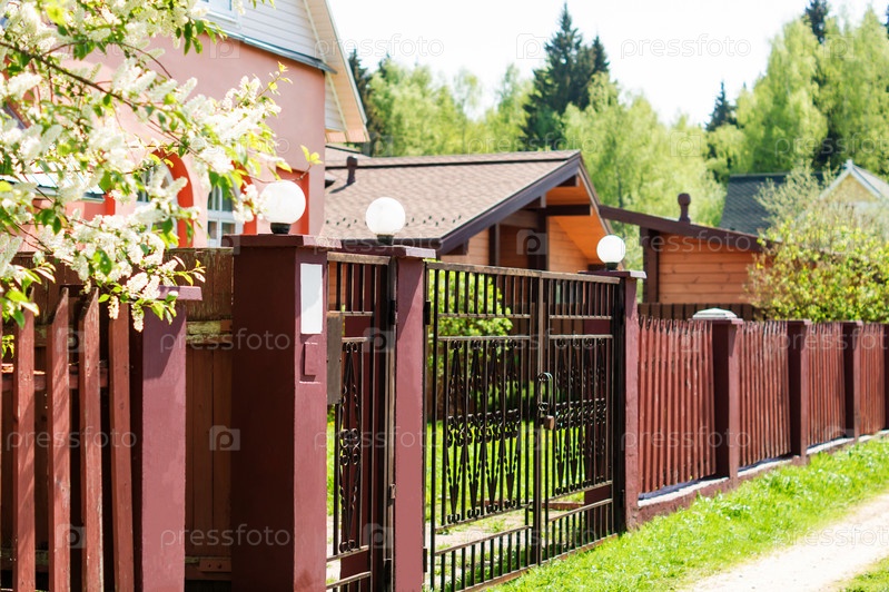 Ворота, забор и весенняя природа. Красочный весенний фон, вход в дом, бордюрная привлекательность