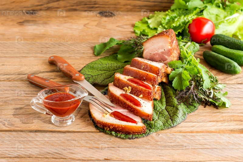 Нарезанная жареная грудинка барбекю на деревянном столе с кетчупом и зелеными овощами